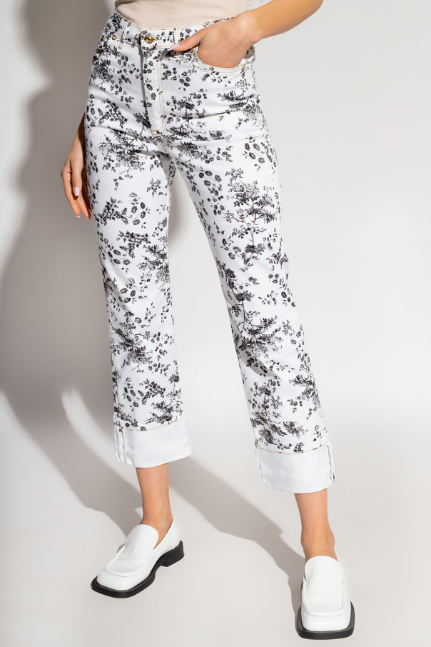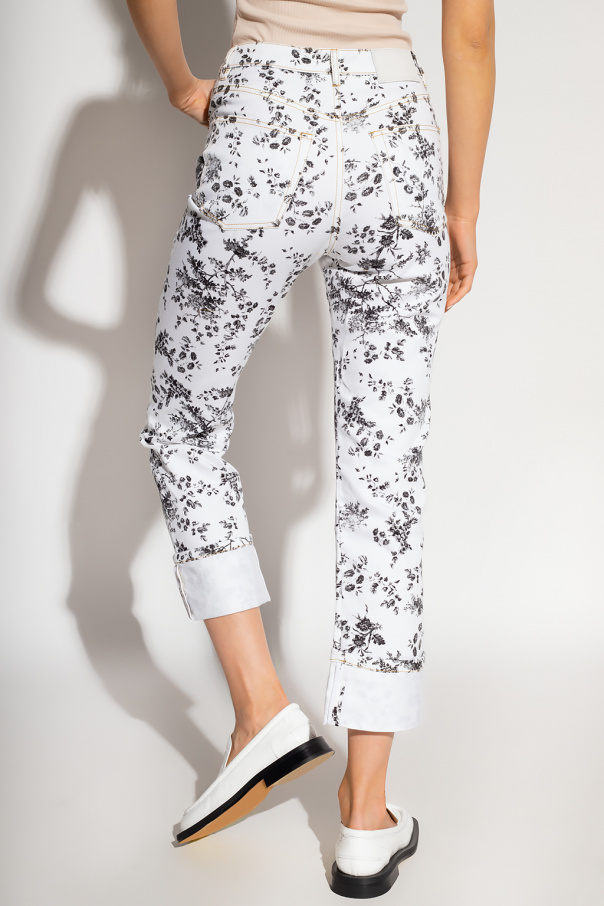 White ‘Nathaniel’ boyfriend jeans from Erdem. Flaunting an all-over grey Edith Etched Leaves print, this pair features a zip fly with a button, classic five pockets, turn-up hems and a white patch with an embossed logo at the back.