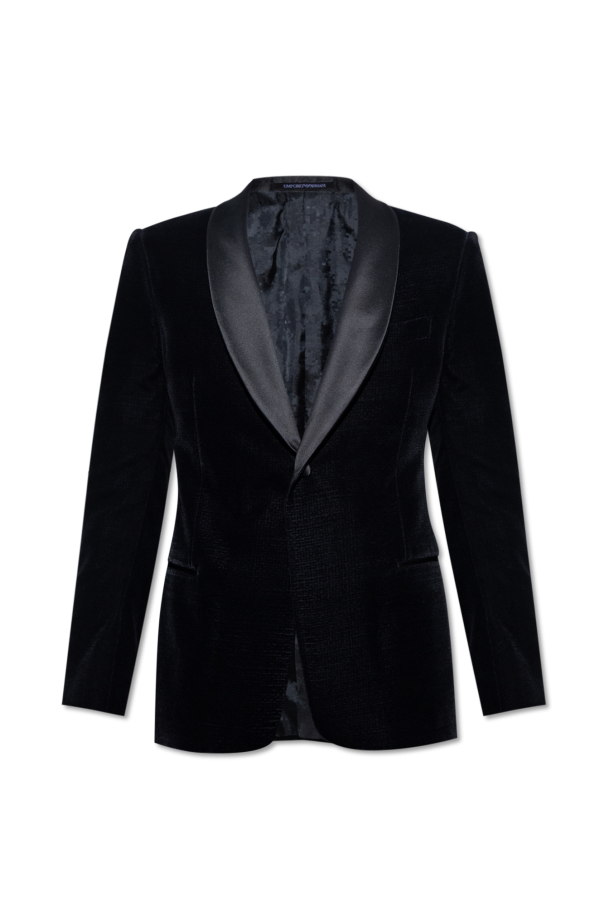 Black velvet blazer from Emporio Armani. Fastened with a button, this garment features a shawl collar finished with satin, three slip pockets and long sleeves finished with buttoned cuffs.