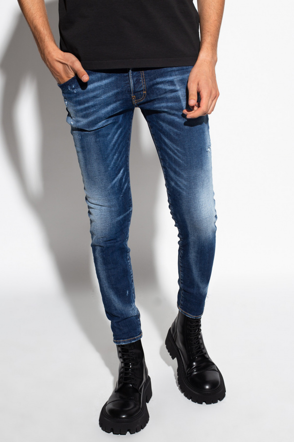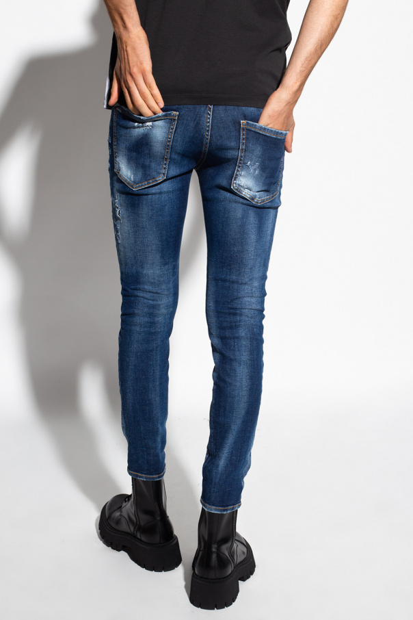 Navy blue ‘Skater’ jeans from Dsquared2. Crafted from cotton with a faded-effect, this pair falls down with tapered legs and features button fastenings, classic five pockets and a beige logo patch on the back.