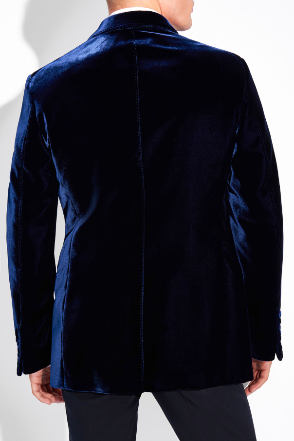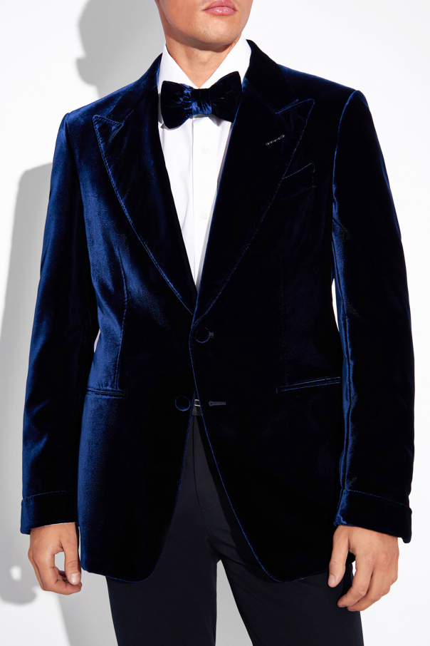 Navy blazer from Tom Ford. Made of velvet, this garment features button fastenings, peak lapels, two flap pockets, one slip pocket, single rear vent and long sleeves with buttoned cuffs.