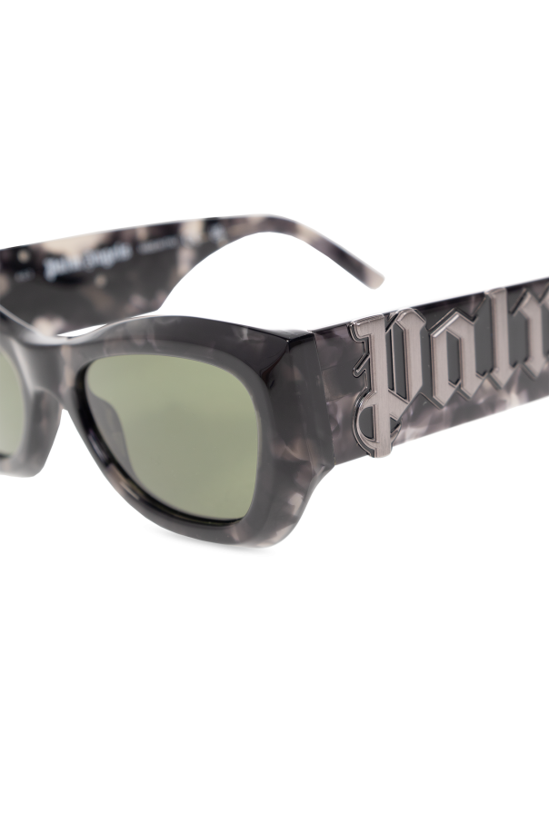 Black and grey cat-eye ‘Canby’ sunglasses from Palm Angels. This pair features wide temples embellished with metal logo-shaped detail in silver-tone, and green lenses with 100% UV protection. Case included.