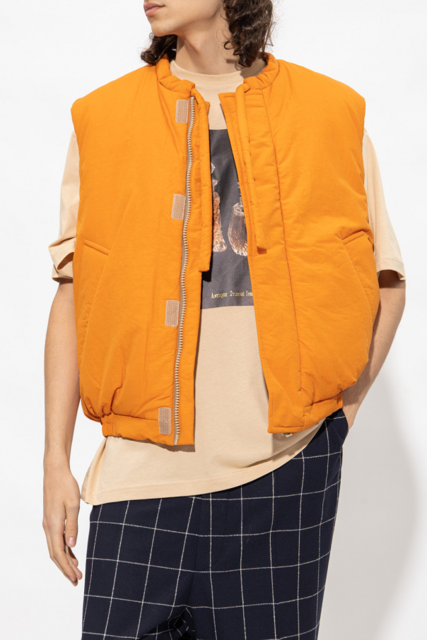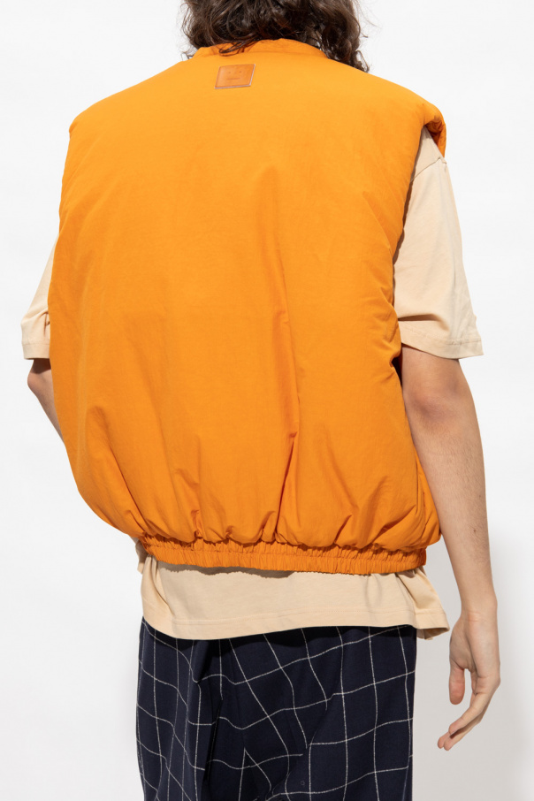 Orange puffer vest from Acne Studios. Crafted partially from recycled material, this style fastens with a zipper and velcro closures and features a drawstring collar, two slip pockets, an elasticated bottom hem and a leather Face logo patch at the back.