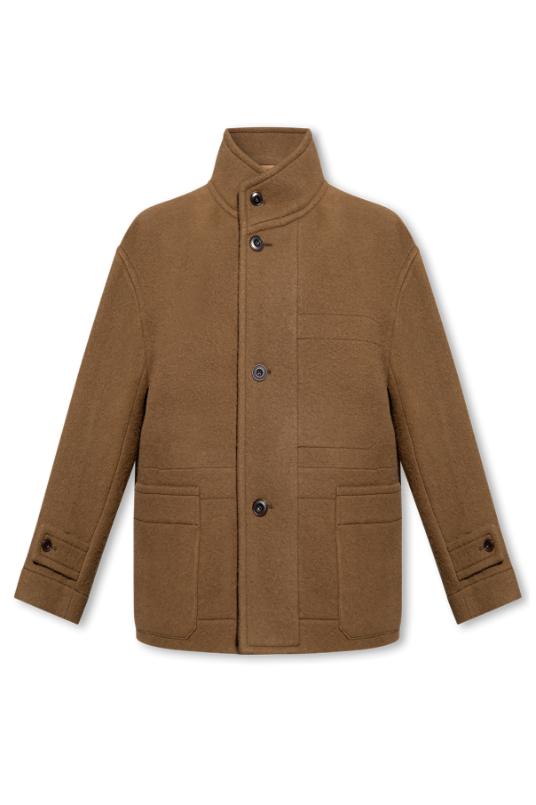 Brown coat with a standing collar from Lemaire. Made from wool, this style fastens with buttons and features two slip pockets, long sleeves and distinctive stitching detailing.