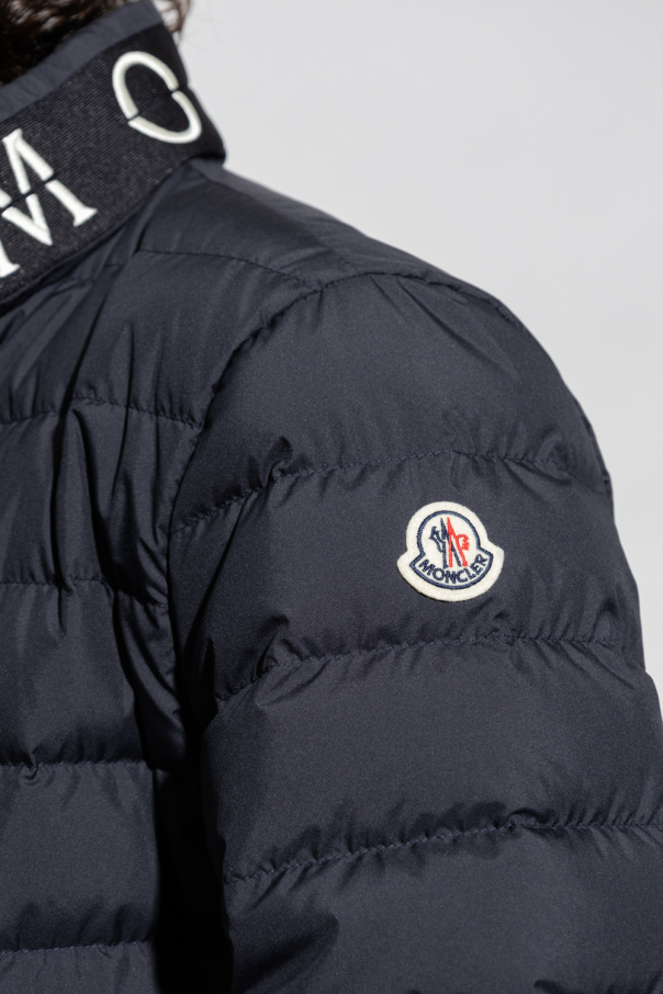 Black ‘Akio’ jacket from Moncler. Made of recycled polyester, this garment features a two-way zip, concealed hood with a white logo embroidery, two front zip pockets, down padding and long sleeves with ribbed cuffs and multicolored logo patch.