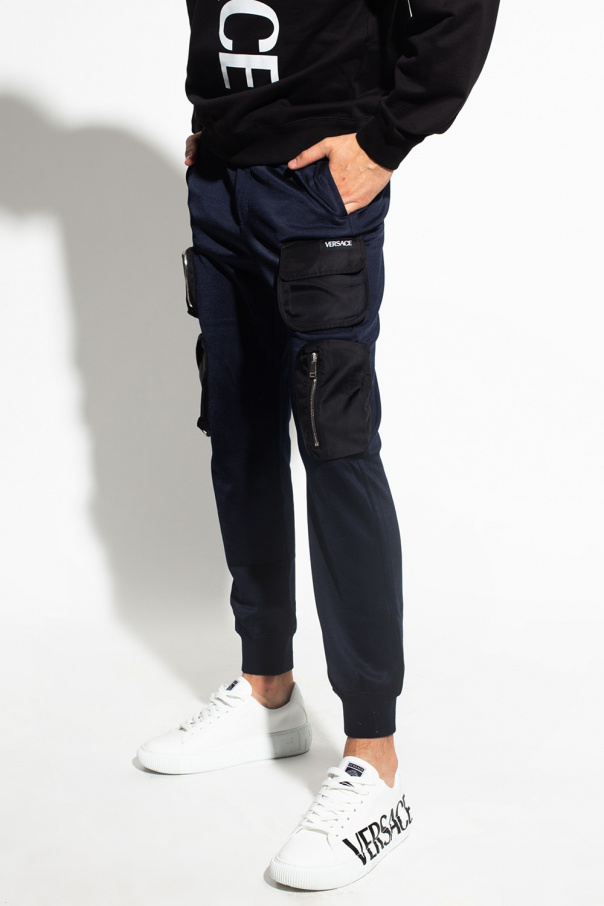 Navy blue and black sweatpants from Versace. Crafted from a cotton blend, this pair features an elasticated waistband, ribbed cuffs and several pockets for added utility.