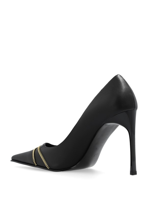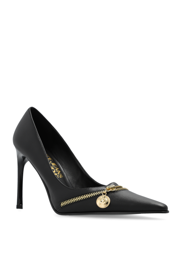 Black pumps from Versace Jeans Couture. Made of faux leather, this item features a decorative zip and logo charm in gold-tone as well as a pointed toe and black rubber sole.