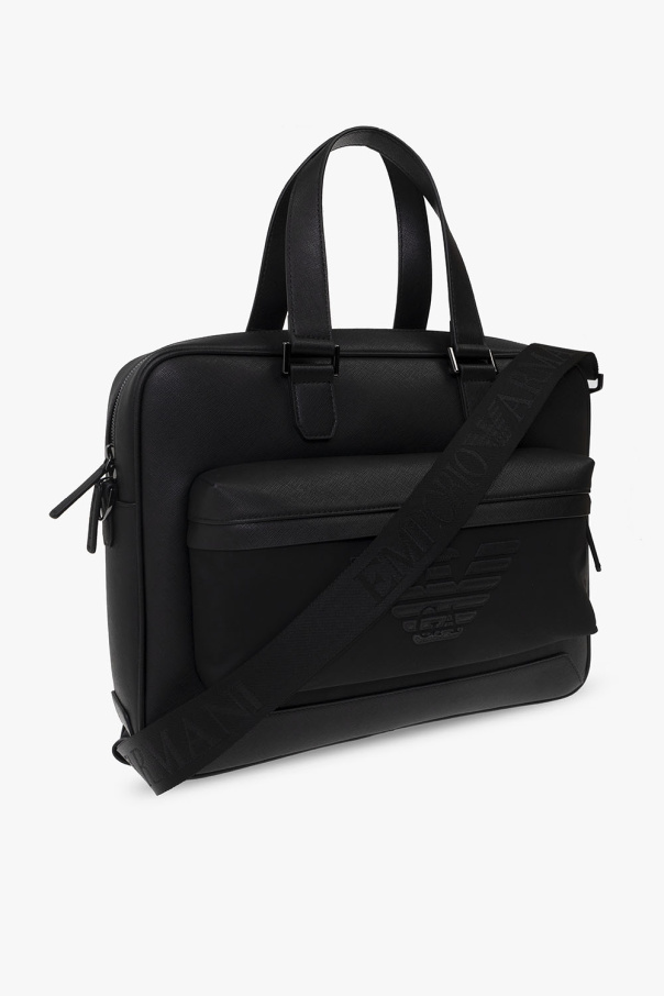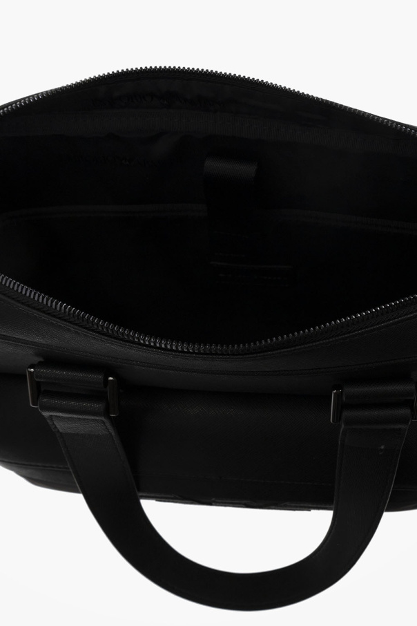 Black briefcase from Emporio Armani, the ‘Sustainable’ collection. Crafted from different fabrics assembled together, this design fastens with a two-way zipper and features a logo patch accompanied by a zip pocket on the front, a back slip pocket, two half-round handles, a detachable and adjustable strap with an embroidered logo and one internal compartment with one velcro-fastened pocket and two slip pockets.