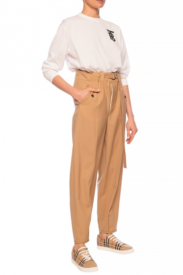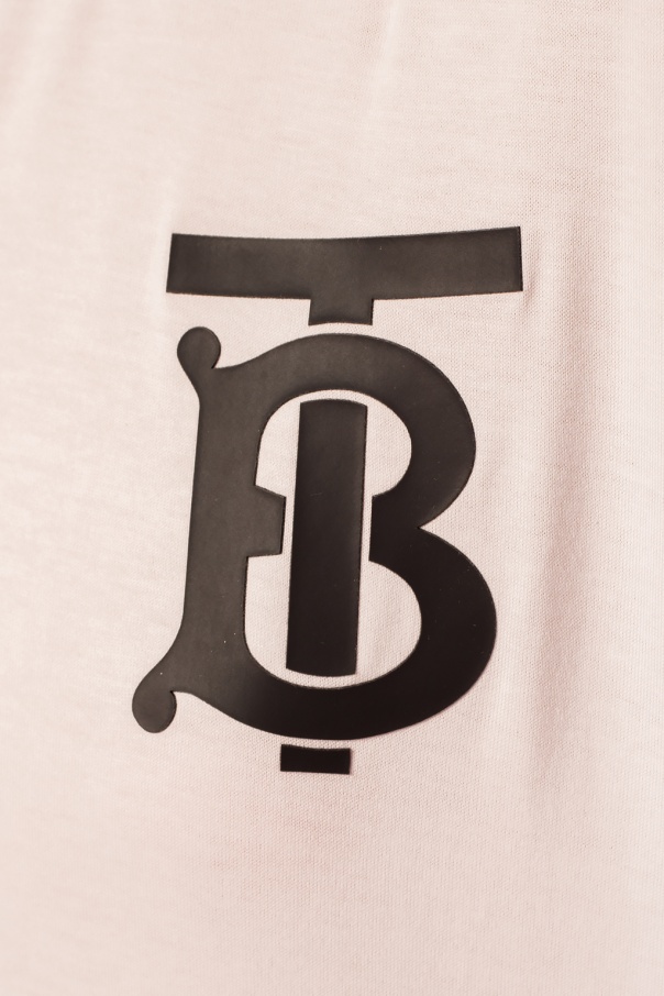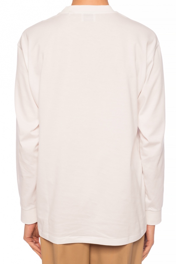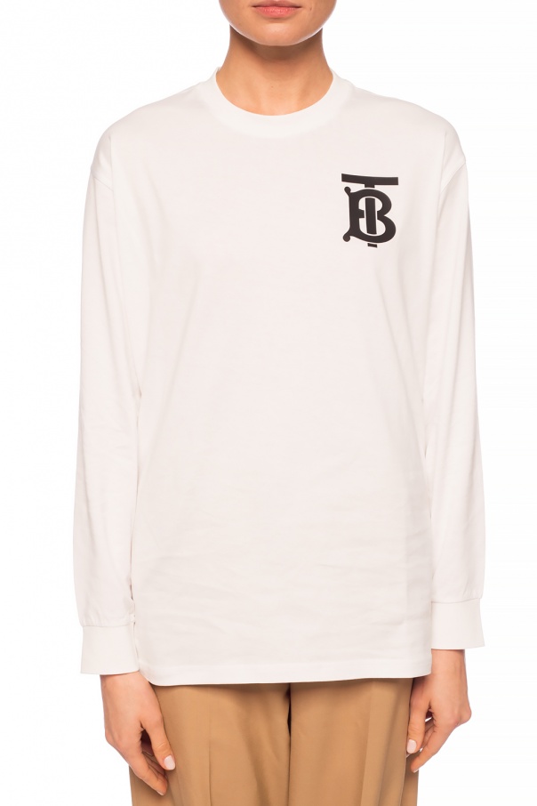 White long-sleeved crewneck T-shirt from Burberry. Made of cotton. Embellished with printed black graphic pattern with logo.