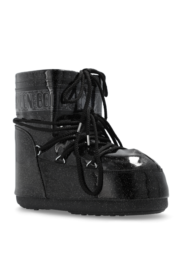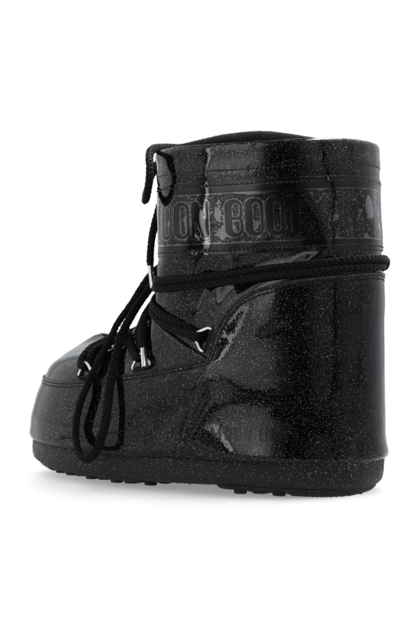 Black ‘Icon Low Glitter’ snow boots from Moon Boot. Made of glittery synthetic material with waterproof properties, this lace-up model sits on a black thermoplastic rubber tread sole and showcases a drawstring upper decorated with logo prints. Inspired by the footwear worn by astronauts during the 1969 lunar landing, this project combines technical features with a contemporary look.