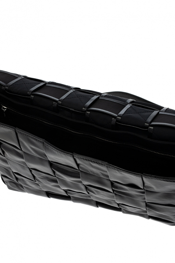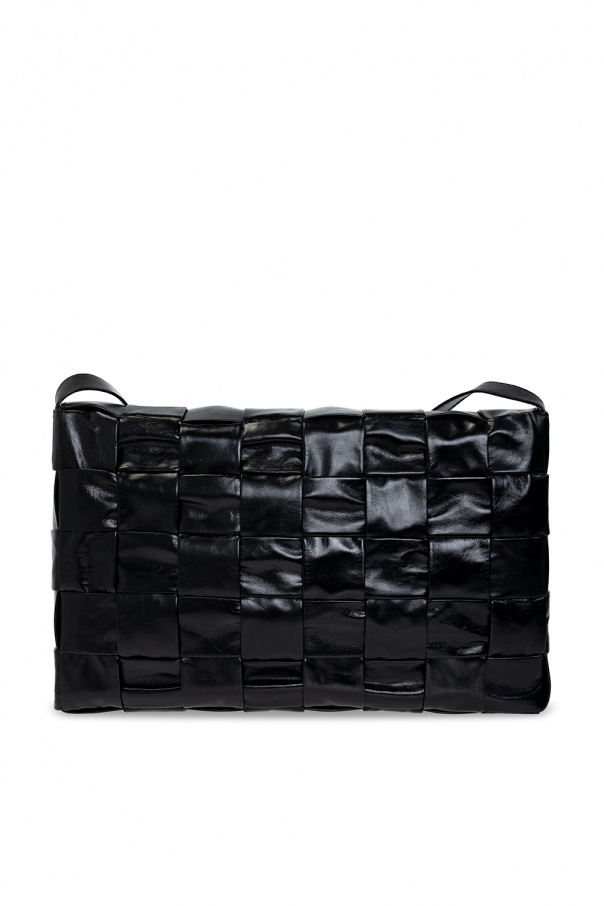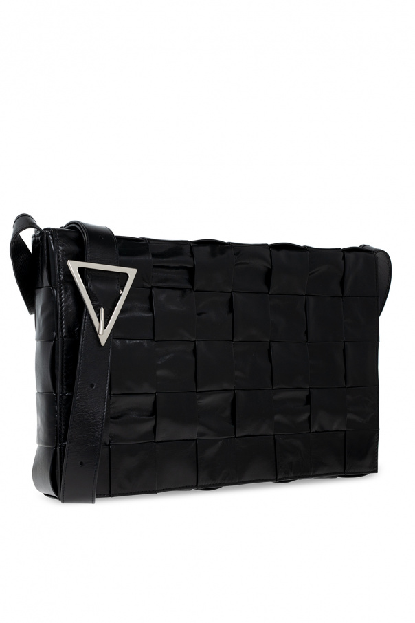 Black ‘Casette’ shoulder bag from Bottega Veneta. Made of leather with the label’s signature Intrecciato weave, this model features an adjustable strap with a triangular metal buckle, silver-tone metal hardware and one internal compartment with one zip pocket.