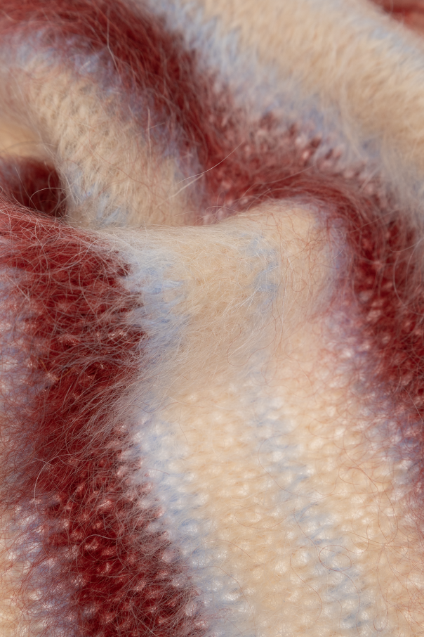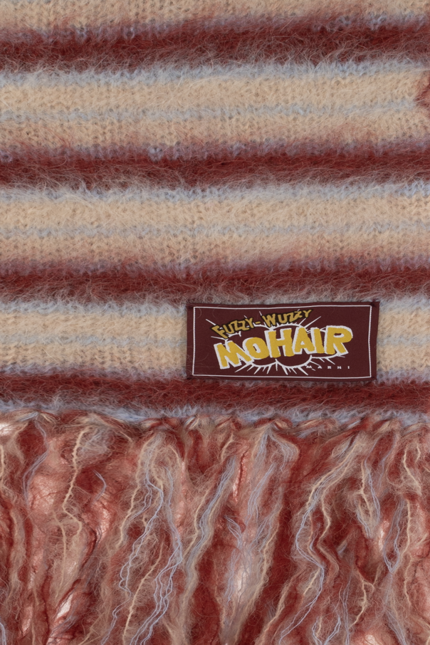 Maroon, blue and pink scarf from Marni x Fuzzy Wuzzy Mohair. Crafted from mohair, this design features a stripe pattern, long fringes and maroon Fuzzy Wuzzy Mohair logo patch.