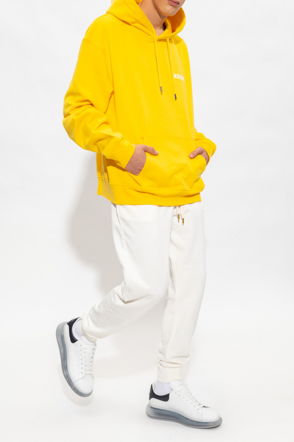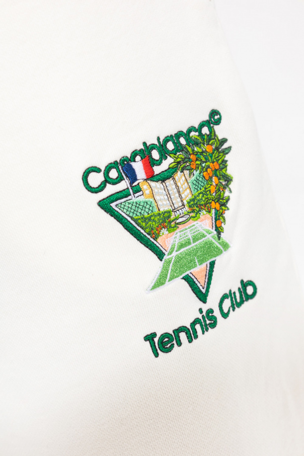 White sweatpants from Casablanca. Made of organic cotton, this pair is complete with an elastic drawstring waist, multicolored embroidered Tennis Club Icon logo pattern, three slip pockets and ribbed cuffs.