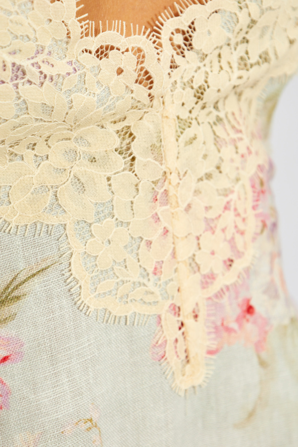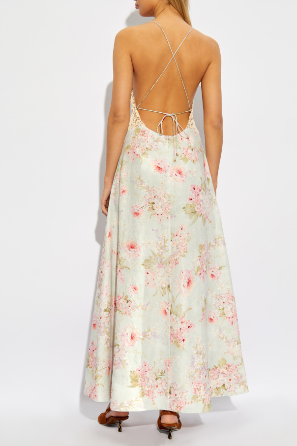 Introducing the epitome of ethereal elegance, the Zimmermann Floral Motif Maxi Dress. Crafted from 100% linen, this exquisite piece offers an unparalleled blend of comfort and sophistication. The dress features a delicate floral pattern sprawled across a pastel palette, with light blue hues dominating, evoking a serene, romantic appeal. The dress is meticulously designed with thin straps and exquisite lace detailing along the neckline, showcasing rich floral patterns that harmoniously blend with the printed motif, creating a cohesive and enchanting look. The minimalist yet elegant silhouette is accentuated by an interesting back construction with criss-cross straps, adding a touch of modernity and uniqueness to the design. Falling gracefully to the ankles, this maxi dress epitomizes timeless style. The fabric's lightweight and airy nature, likely a blend incorporating natural fibers, ensures breathability and a slight sheen, enhancing its luxurious feel. The lace's quality and craftsmanship are evident in its delicate cutouts and diverse stitches, adding subtle charm and romantic character to the dress. Designed for special occasions such as summer soirees, weddings, or other elegant events, this dress speaks volumes of understated luxury, with its discreet branding emphasizing the design and craftsmanship over overt labels. Additional features include a neck tie, a back zipper for ease of wear, and side pockets for added practicality, making this dress not only a vision of beauty but also of convenience. Why Purchase This Dress? Exquisite craftsmanship and quality material - 100% linen Charming floral motif and lace details for a romantic, sophisticated look Unique back construction with criss-cross straps for a modern twist Perfect for special occasions, offering both elegance and comfort Practical features such as side pockets and a back zipper for convenience