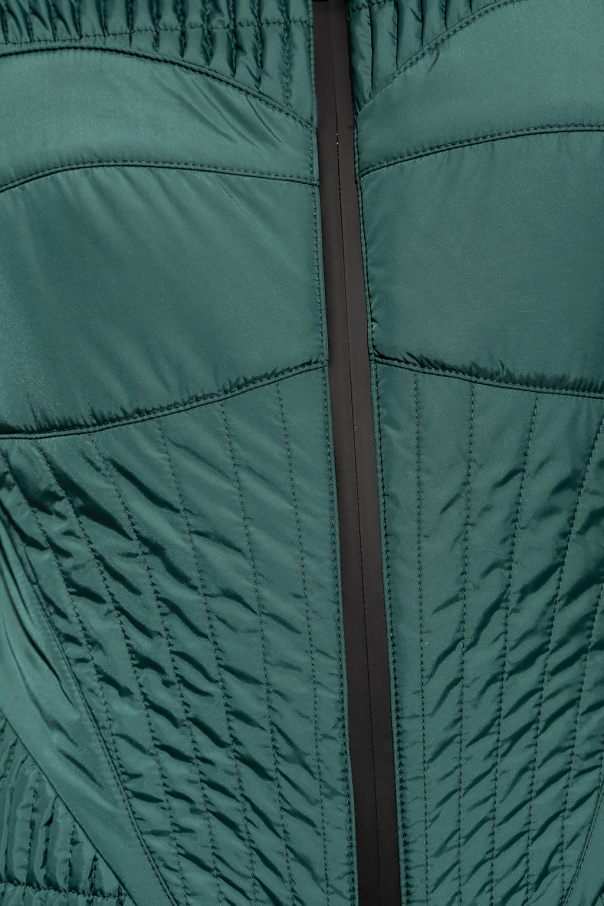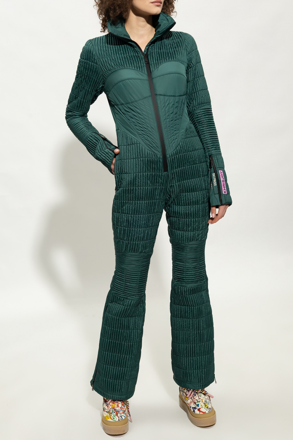 Dark green ski jumpsuit from Khrisjoy. Crafted with a form-fitting silhouette, this style features distinctive quilting, a zip fastening, two zip pockets, long sleeves with zipped cuffs and a rubber logo patch and long narrow legs with zipped hems.
