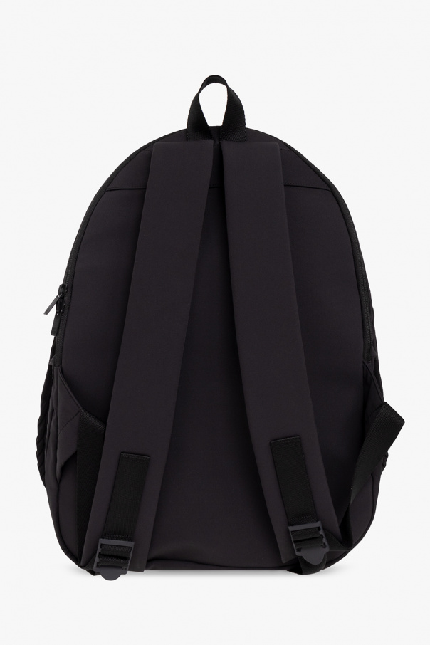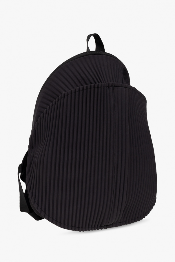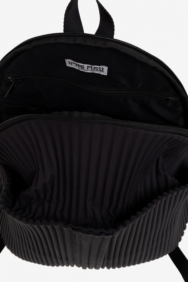 Black backpack from Issey Miyake Homme Plisse. Distinguished by pleats, this design features a two-way zip fastening, a zip front pocket, a half-round handle, adjustable straps and one internal compartment with one zip pocket and one drawstring-cinched pocket.