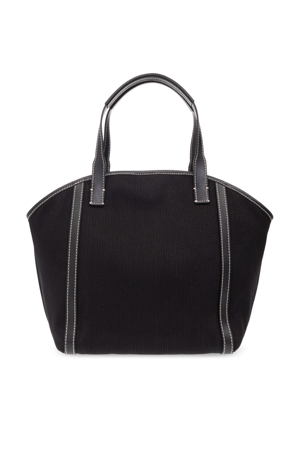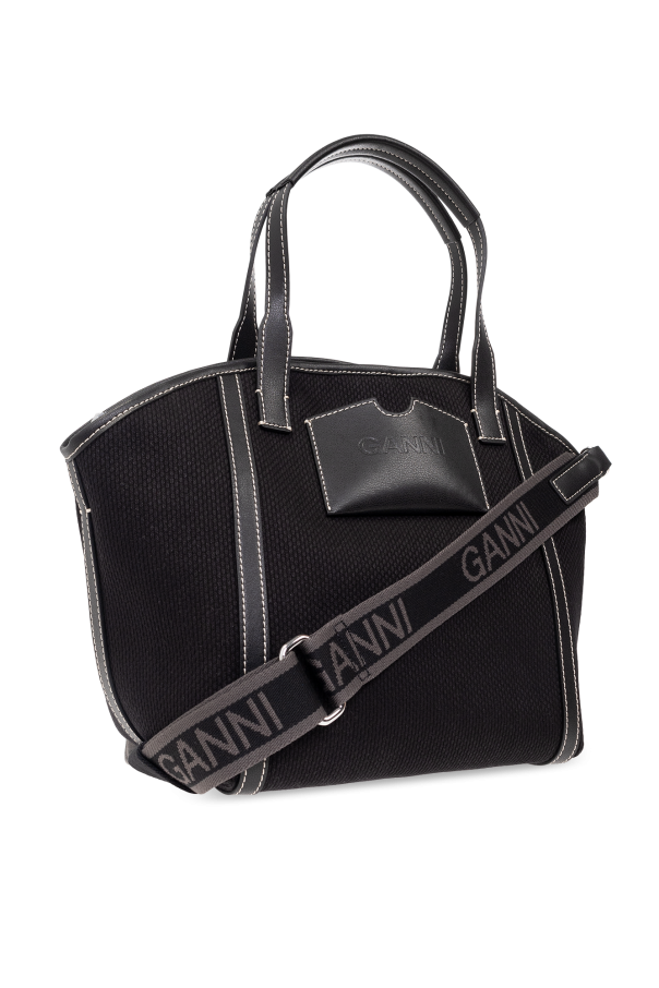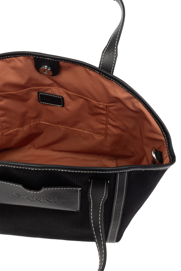 Black shopper bag from Ganni. Made of canvas trimmed with faux leather, this model features a magnetic snap, card slot decorated with an embossed logo on the front, two half-round handles, detachable and adjustable strap and one compartment with one slip pocket.