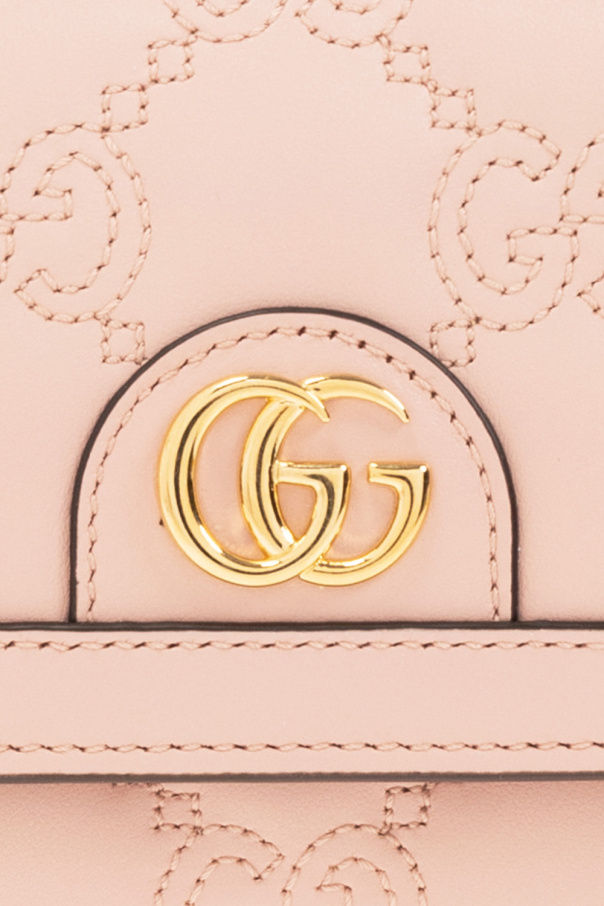 Light pink wallet from Gucci. Crafted in quilted ‘GG Matelassé’ leather, this design features a snap fastening, ‘Double G’ hardware on the front, gold-tone metal elements and one bill compartment, one zip coin pocket and one compartment housing seven card slots inside.