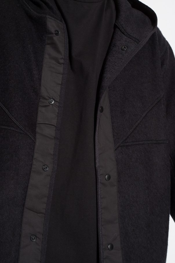 Black hoodie from Y-3 Yohji Yamamoto. Crafted from a wool and cotton blend, this style features a logo patch on the side, snap closures on the front and sides, two slip pockets and elasticized piping on the bottom hem and long sleeves.