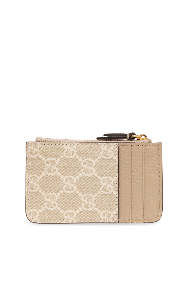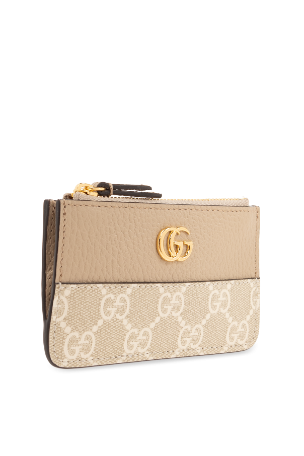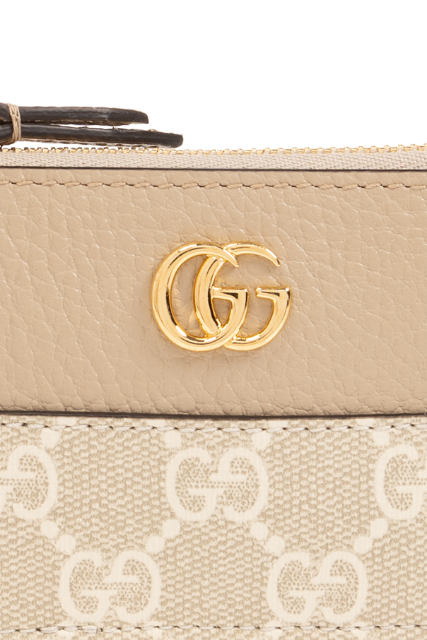Beige and cream key case from Gucci. Made of ‘GG Supreme’ canvas and leather, this item fastens via a zip and showcases a gold-tone metal logo plaque on the front and one internal compartment with a lobster clasp on a chain.