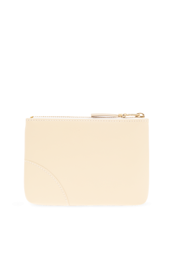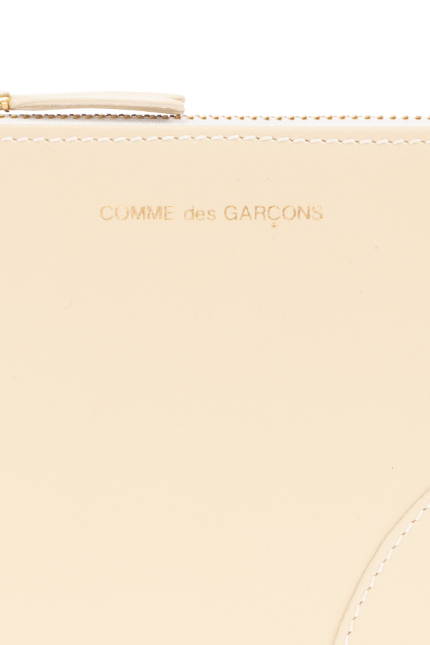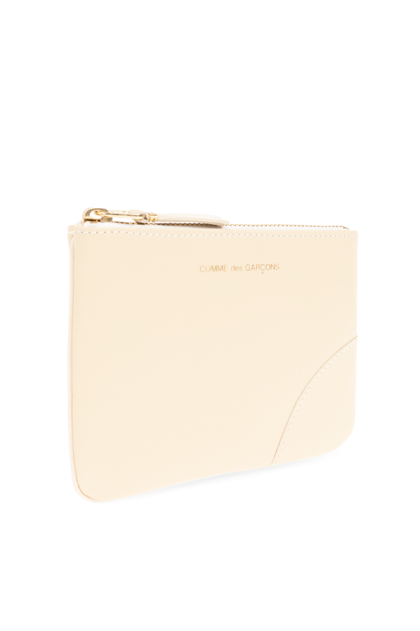 Cream pouch from Comme des Garcons. Made of leather, this item features a zip fastening, logo print, gold-tone metal hardware and one internal compartment.