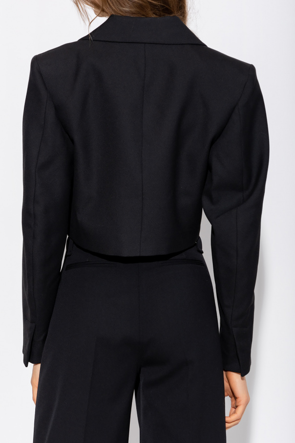 Black blazer from Ganni. Crafted from a fabric blend including recycled polyester and ECOVERO, this style features a double-breasted silhouette with a gold-tone twist fastener, lapel collar, slip chest pocket and long sleeve with slits.