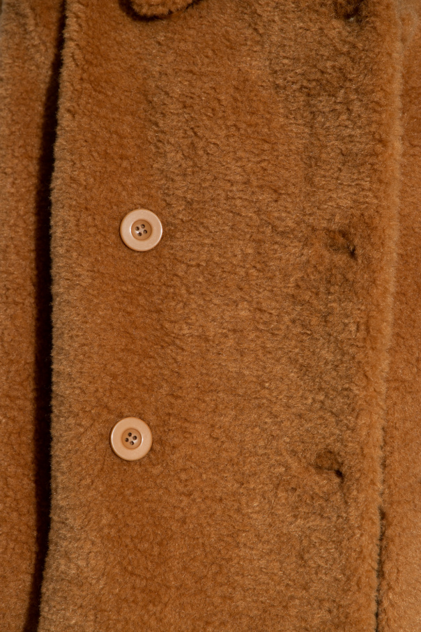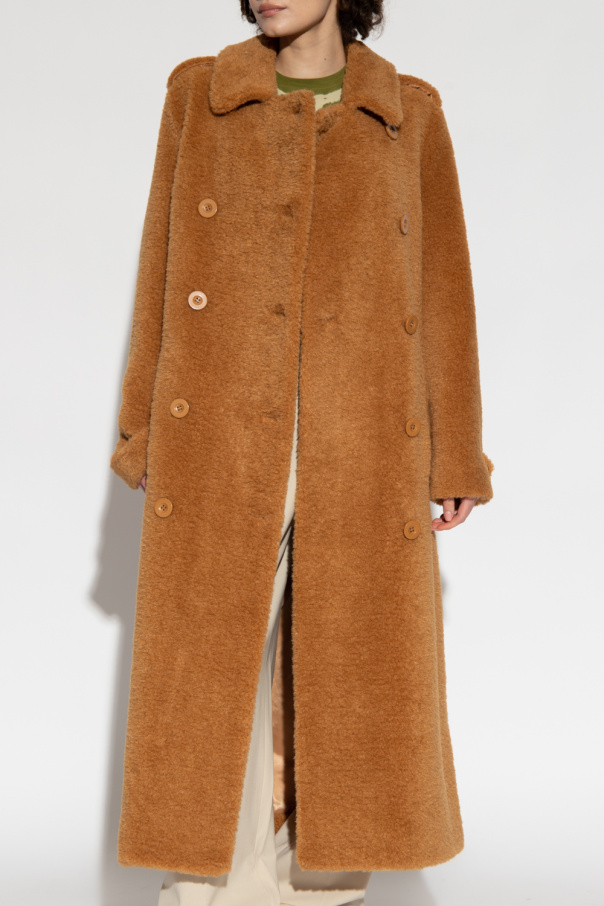 Brown ‘Towa’ double-breasted coat from STAND STUDIO. Crafted from faux fur, this design features button fastenings, waist belt, buttoned epaulettes, two slip pockets, single rear vent and long sleeves with adjustable buttoned cuffs.