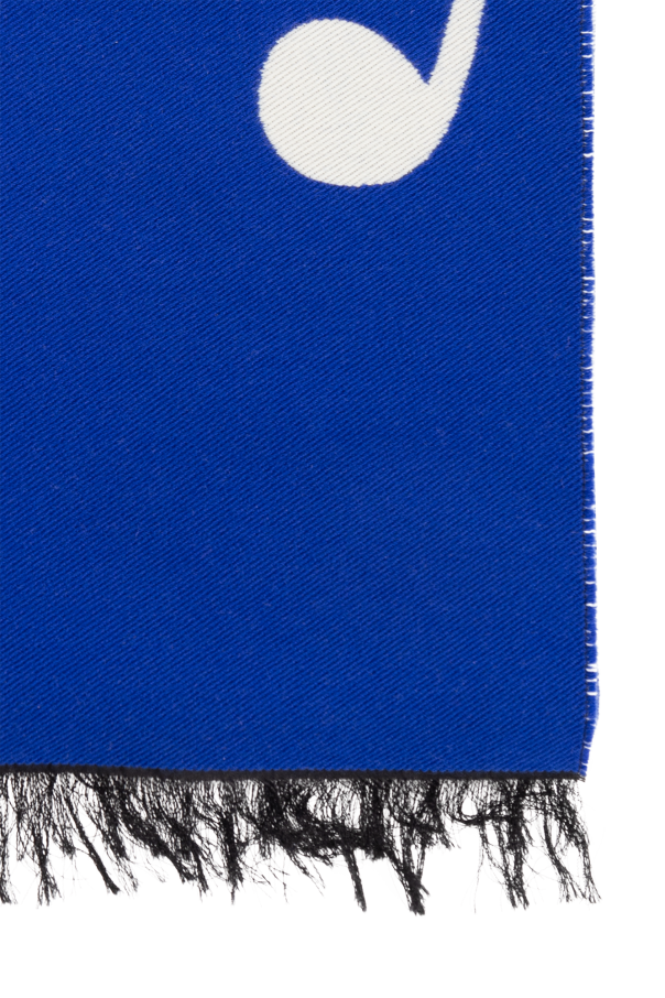 Dark blue and white scarf from Burberry. Made of a wool and silk blend, this item showcases a logo pattern and fringed edges.