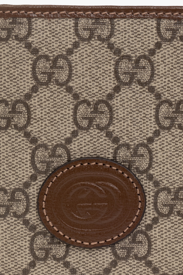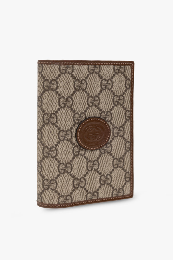 Beige and brown passport holder from Gucci. Crafted in calf leather and ‘GG Supreme’ canvas, this design features a snap fastening, an ‘Interlocking G’ logo patch on the front and four slip pockets and three card slots inside.