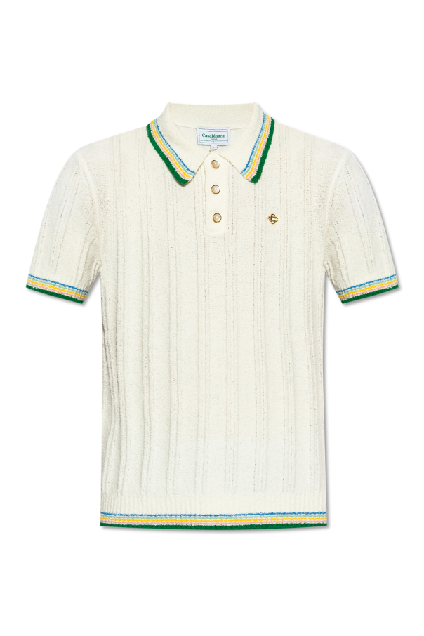 Introducing the Casablanca Frotte Polo, a masterpiece of casual elegance and sportive flair. Crafted with the finest blend of cotton, nylon, and a touch of elastane, this white polo shirt exudes a luxurious comfort and a tailored fit that caters to the discerning gentleman's wardrobe. The shirt's texture, reminiscent of plush terry cloth, is adorned with vertical embossed lines that lend it a distinctive character. The polo's design is accentuated by a classic round neckline with a sophisticated collar, meticulously finished with dual stripes in vibrant green and yellow, echoing a sporty yet refined aesthetic. The hem mirrors this detail, creating a harmonious symmetry. Its short sleeves, also highlighted by the same striped pattern, complement the overall look with a dash of elegance. Functionality meets luxury with three large, pearl-like buttons at the collar, offering a hint of opulence with every fastening, while a small, golden metallic logo on the left breast proudly displays the Casablanca insignia, symbolizing the brand's commitment to excellence and high fashion. This garment is not just a piece of clothing; it is a statement of sophisticated taste and a nod to sportive elegance. Why Choose This Product? Exclusive Design: Unique frotte material with embossed vertical lines for an unmistakable texture. Luxury Details: Pearl-like buttons and a metallic designer logo add a touch of opulence. Sportive Elegance: Striped accents in green and yellow offer a refined yet sporty look. High-Quality Materials: A premium blend of cotton, nylon, and elastane ensures comfort and durability.