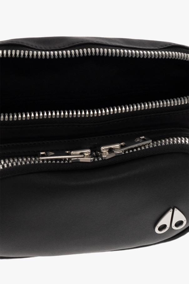 Black belt bag from Moose Knuckles. Crafted from fabric and leather, this design fastens with a two-way zipper and features a frontal pocket with a two-way zipper and monogram hardware, an adjustable strap with a jacquard logo motif, silver-tone metal elements and one internal compartment with a zip pocket.