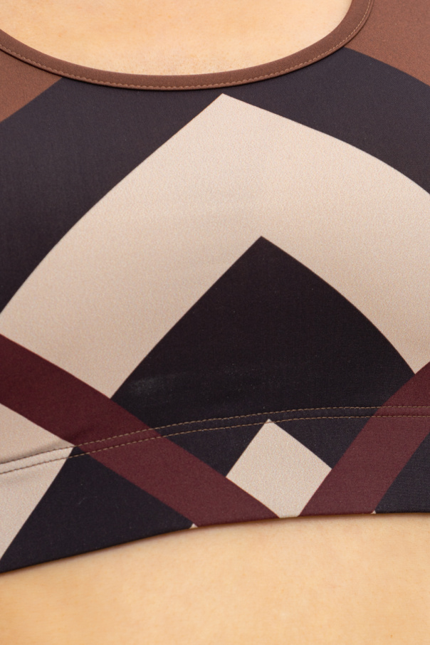 Brown ‘Immy’ tank top from Burberry. Crafted with a cropped fit, this style showcases a round neck and a geometrical pattern in black, maroon and cream.