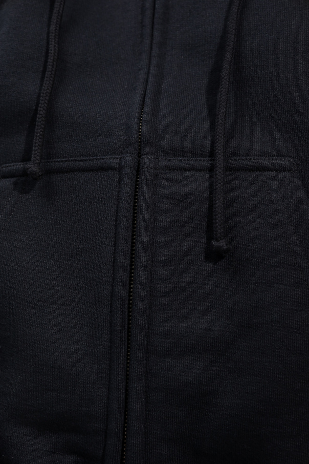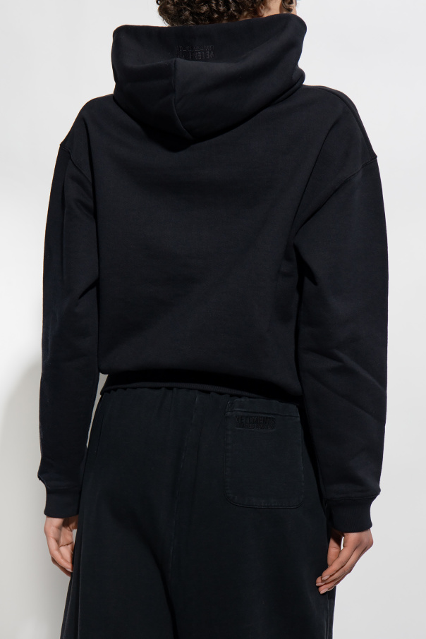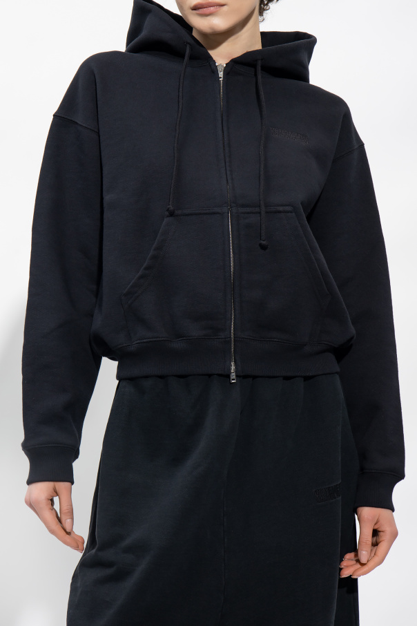Black sweatshirt with a drawcord-adjustable hood from VETEMENTS. Made of cotton, this style fastens with a hidden two-way zipper and features logo embroidery on the front and hood, two slip pockets, long sleeves and ribbing on the bottom hem and cuffs.