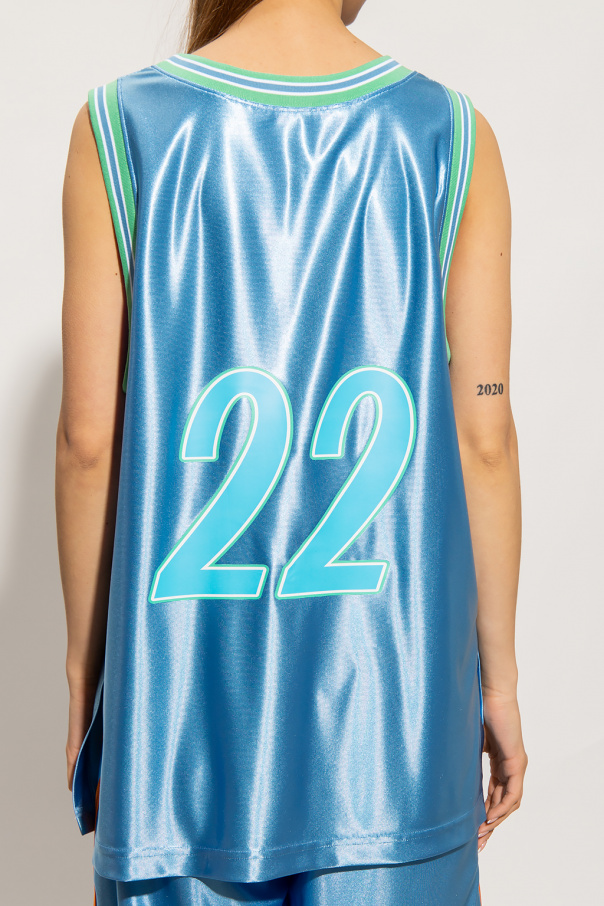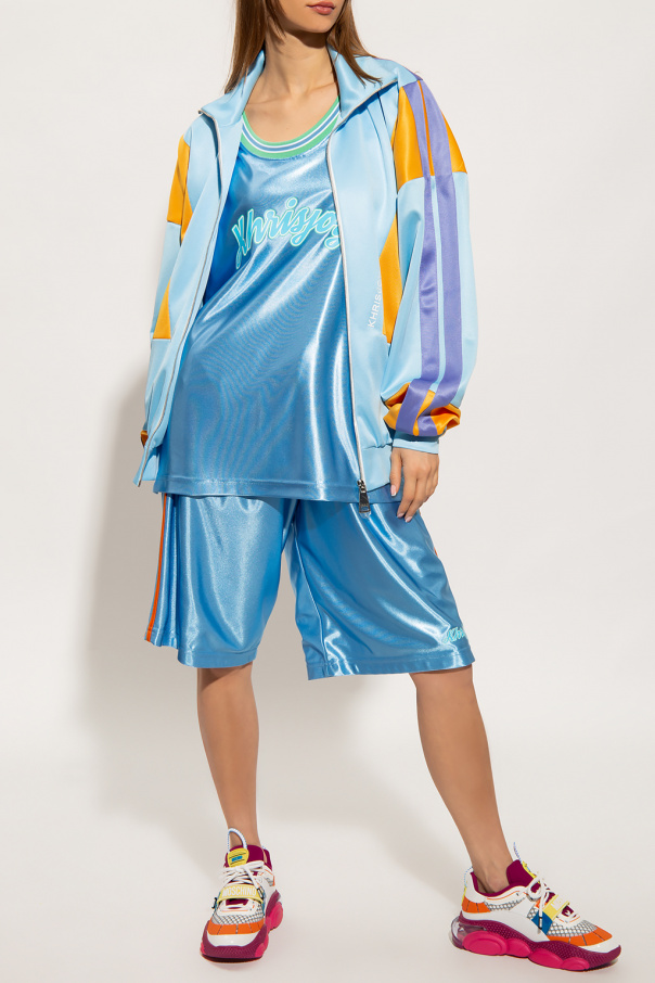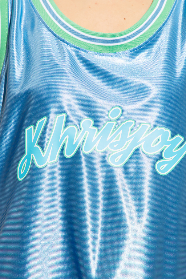 Blue crewneck tank top from Khrisjoy. Embellished with a blue, white and green graphic pattern with the brand's logo, this style features an elasticated collar and decorative snap closures on the sides.