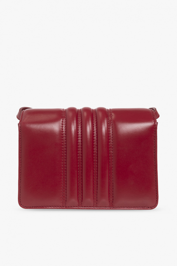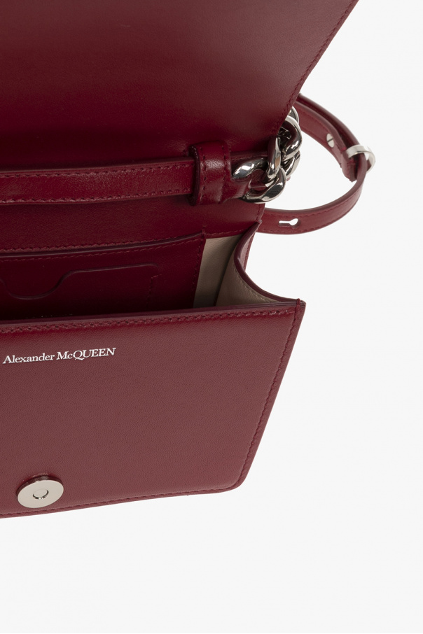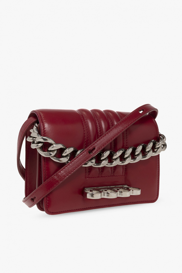 Dark red ‘Four Ring Mini’ shoulder bag from Alexander McQueen. Made of lamb leather, this model is complete with a snap closure, metal ring handle, decorative quilting, wrist chain, detachable and adjustable shoulder strap, silver-tone metal hardware and one internal compartment with one slip pocket and one card slot.