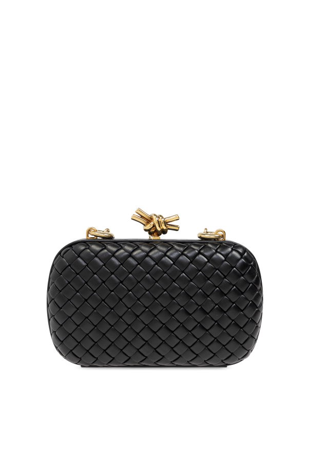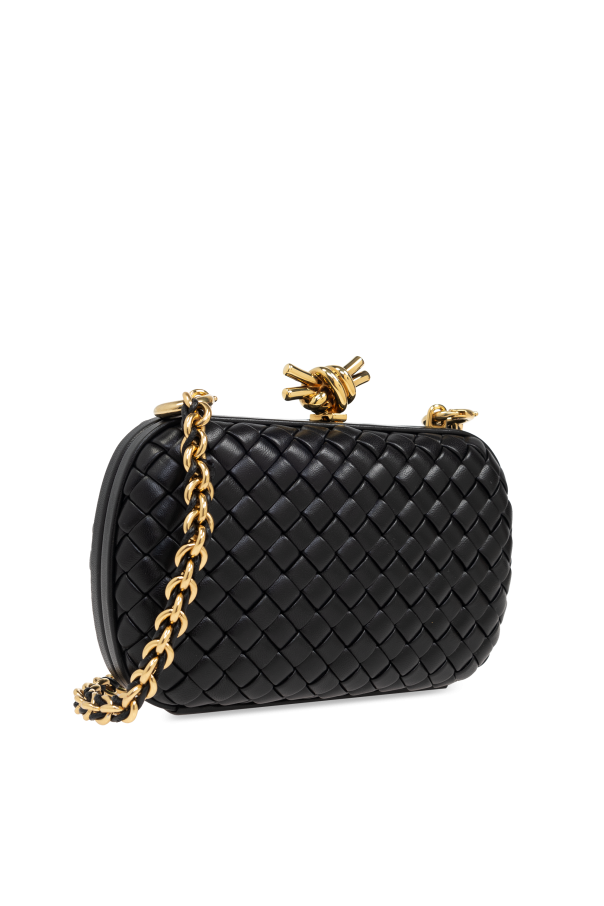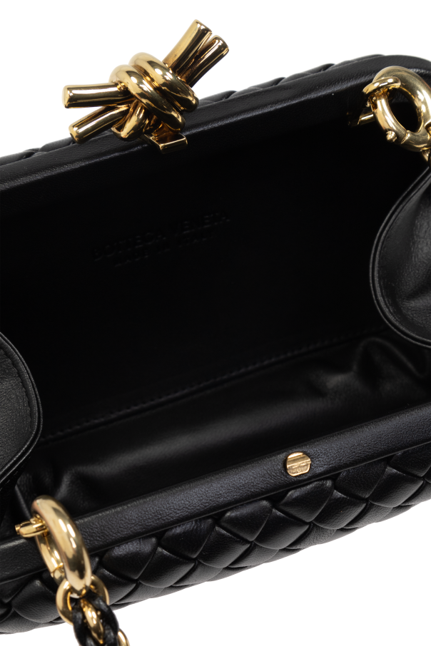 Introducing the epitome of sophistication - the Knot Small Clutch by Bottega Veneta. Crafted with unparalleled precision, this rectangular box-shaped clutch transcends the ordinary with its exquisite quilted pattern. The harmonious alignment of diagonal lines creates a diamond motif, bestowing an air of classic elegance upon this accessory. The clutch is enveloped in a timeless black hue, ensuring versatility and compatibility with an array of ensembles. It is the golden details, however, that elevate this piece to the pinnacle of luxury. An ornamental knot, shimmering in polished gold, serves as a unique closure, while the shoulder chain, composed of interlinked segments, adds both functionality and flair. The interior boasts a sleek, black lining complemented by golden branding, subtly indicating its prestigious origin. Every aspect, from the discreet golden emblem on the reverse to the meticulous quilting, has been thoughtfully designed to create a clutch that is not only a statement of style but a masterpiece of craftsmanship. Why Purchase This Product? Exclusive Design: Part of an elite collection, the Knot Small Clutch is a testament to Bottega Veneta's innovative and refined aesthetic. Luxurious Materials: Crafted from 100% leather, this clutch exudes quality and durability. Functional Elegance: The snap closure ensures your belongings are secure, blending convenience with elegance. Versatile and Timeless: Its classic black color and golden accents make it a perfect companion for any occasion, promising to elevate your outfit with its understated glamour.