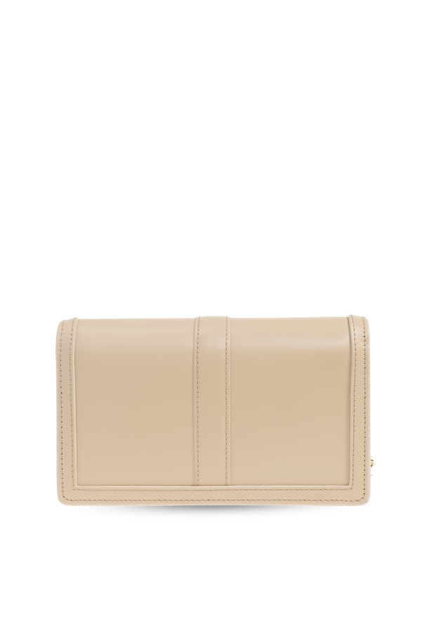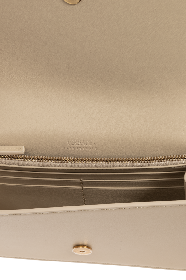 Beige ‘Greca Goddess Mini’ wallet on a chain from Versace. Made from smooth leather, this item fastens via a magnetic snap and showcases a signature Greca application and an engraved logo on the front, gold-tone metal elements as well as a long chain strap and one internal compartment with one zip pocket, two slip pockets and eight card slots.