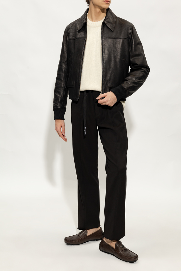 Brown loafers from Emporio Armani. Made of leather, this pair features an embossed monogram pattern, metal monogram appliqué, embossed logo detail and black rubber sole.