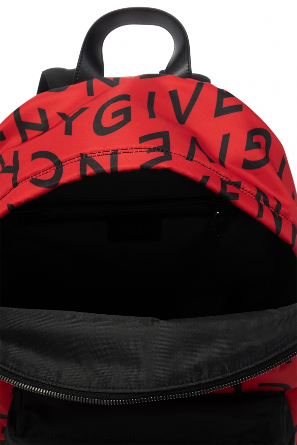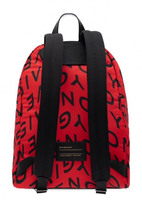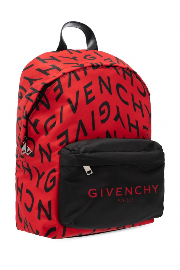 Black and red ‘Urban’ backpack from Givenchy. Fastened with a two-way zip, this design features a logo print, front zip pocket, half-round handle, adjustable shoulder strap, silver-tone metal hardware and one internal compartment with black lining and one zip pocket.