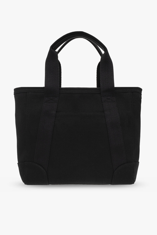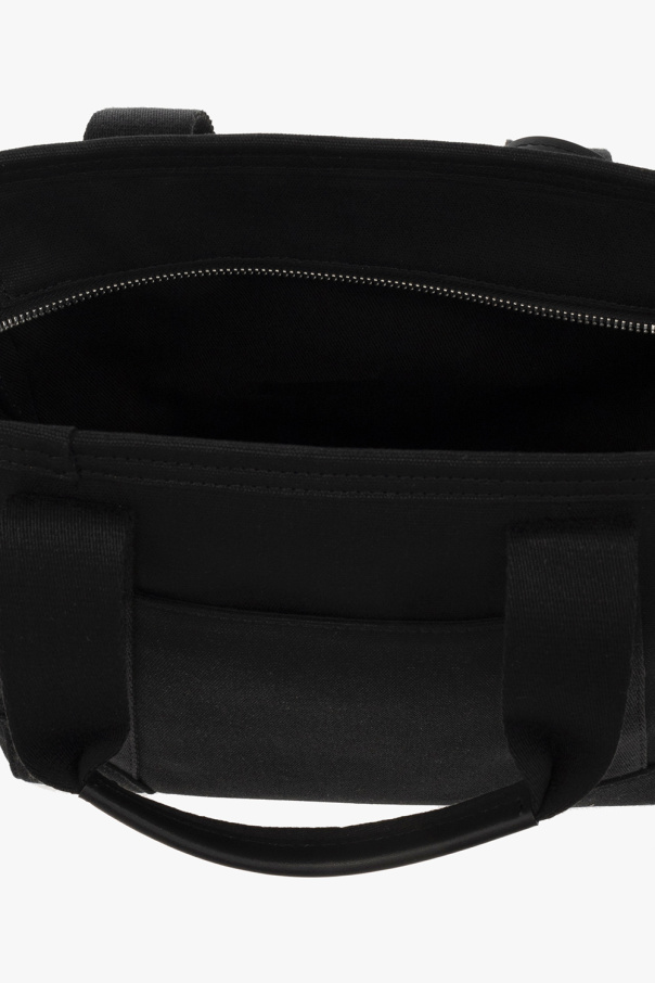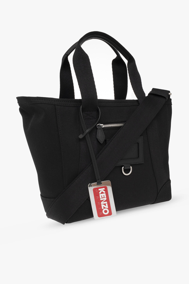 Black shoulder bag from Kenzo. Crafted from cotton, this design fastens with a zipper and showcases a logo patch accompanied by a zip pocket on the front, a detachable silver-tone metal application with a red and white logo, two half-round handles, a detachable and adjustable shoulder strap, silver-tone metal hardware and one internal compartment with one slip pocket and one card slot.