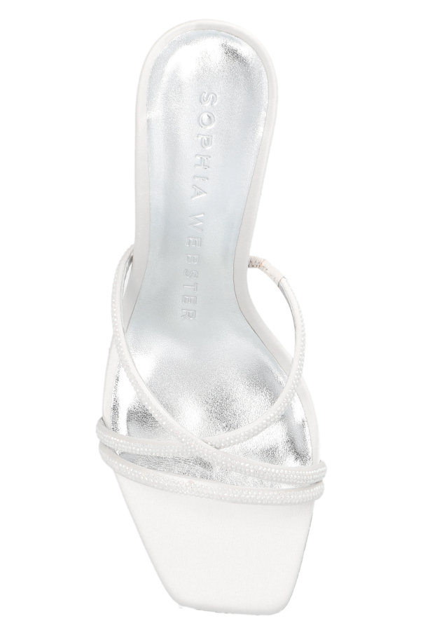 Light grey ‘Aphrodite’ heeled mules with a satin finish from Sophia Webster, the ‘Bridal’ collection. Decorated with crystals, this pair features a square toe, heel with heart details and beige leather sole with printed ‘Wifey For Lifey’.