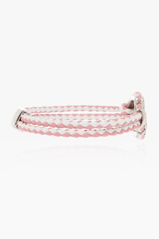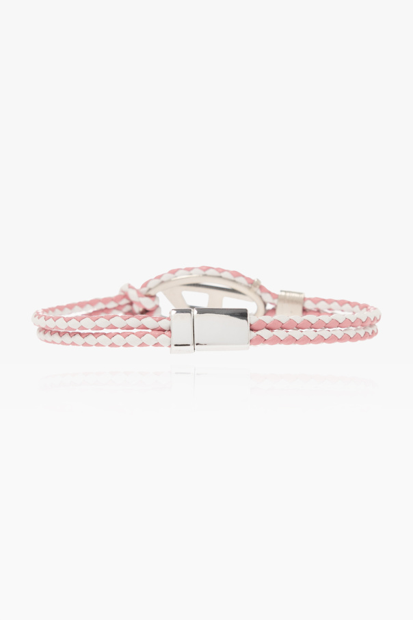 Pink and white ‘A-ROPE’ bracelet from Diesel. Made of leather, this item features a metal logo detail in silver-tone and magnetic snap closure.