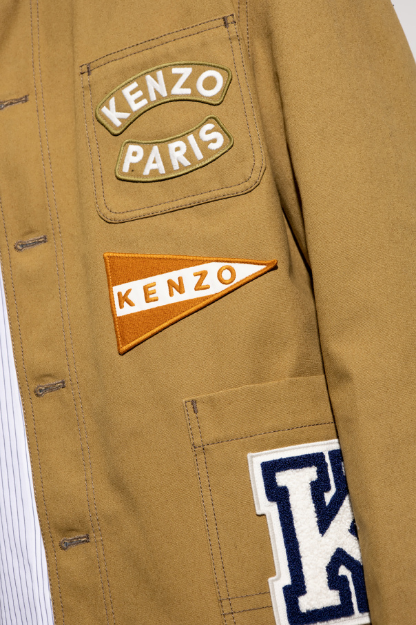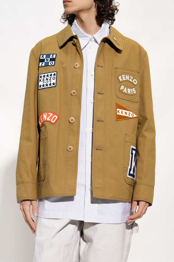 Khaki jacket from Kenzo. Made of cotton, this style fastens with buttons and showcases a collared neckline, colourful logo patches, two slip pockets and long sleeves with button cuffs.