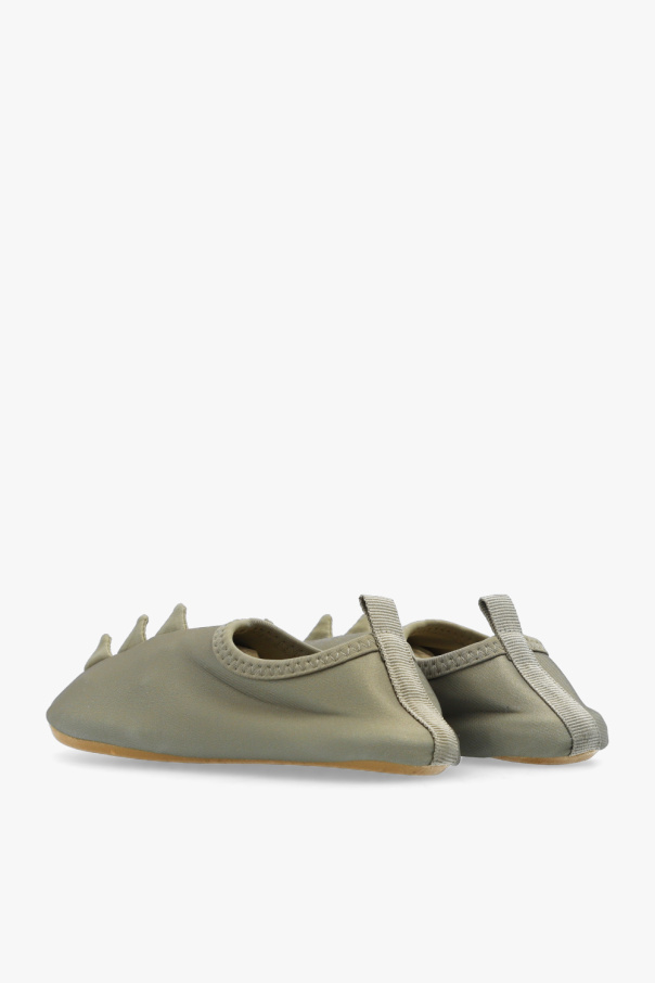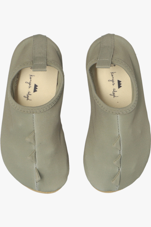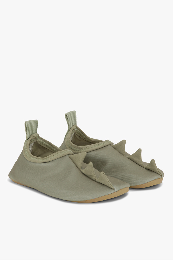Green swim shoes from Konges Slojd. Crafted from recycled material with the highest ultraviolet protection factor, UPF 50+. Sitting on a beige sole in ultralight EVA foam, this model showcases a signature dinosaur motif on the front and a pull tab at the back.