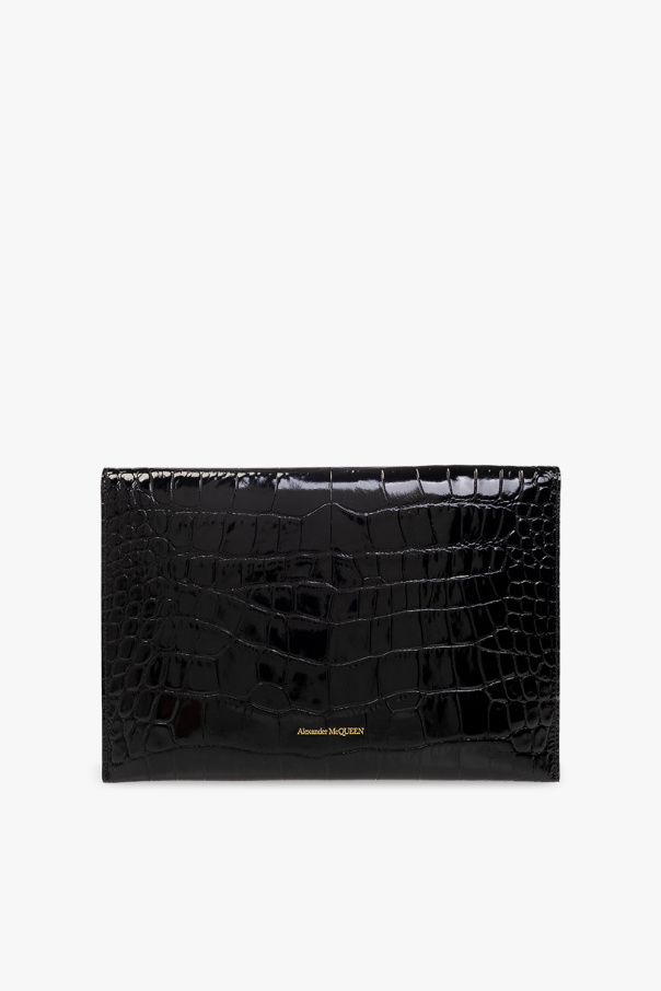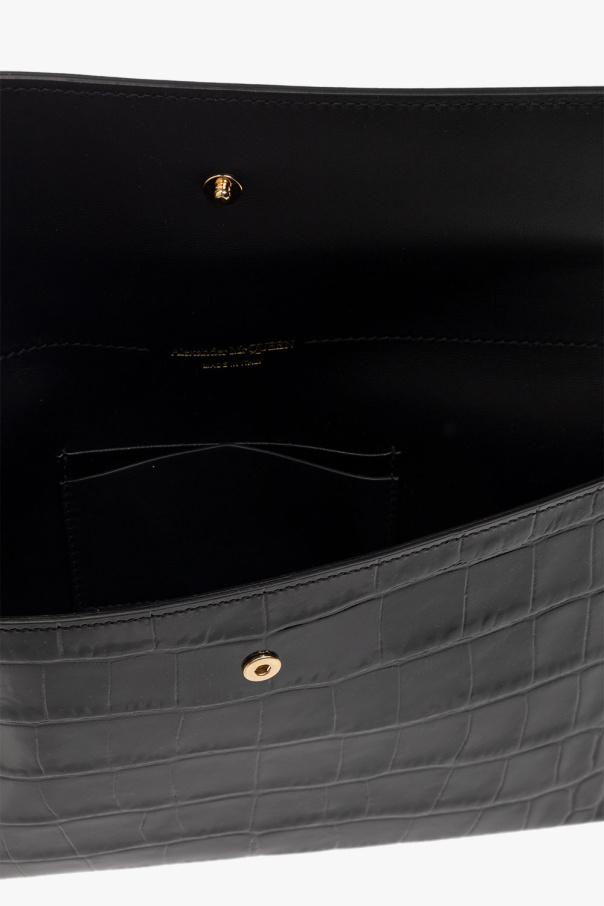 Black ‘Envelope’ clutch from Alexander McQueen. Crafted from patent calf leather with a crocodile skin effect, this design features a metal skull detail embellished with Swarovski crystals, logo printed at the back, antique gold-tone metal hardware and one internal compartment with two card slots.