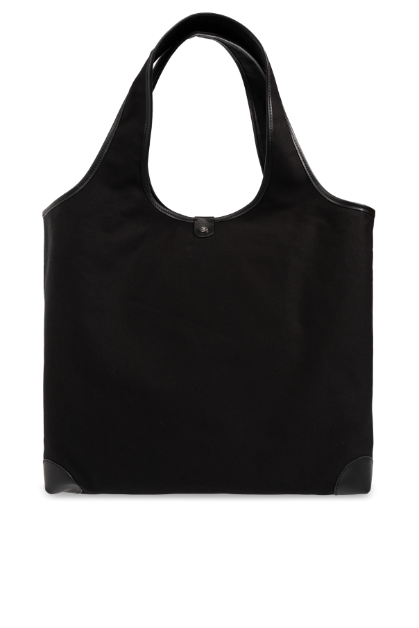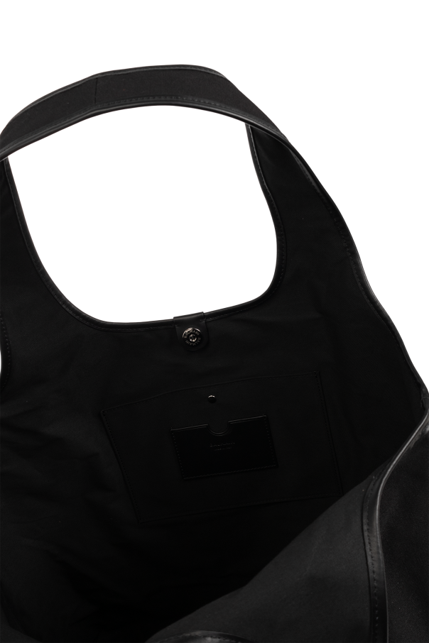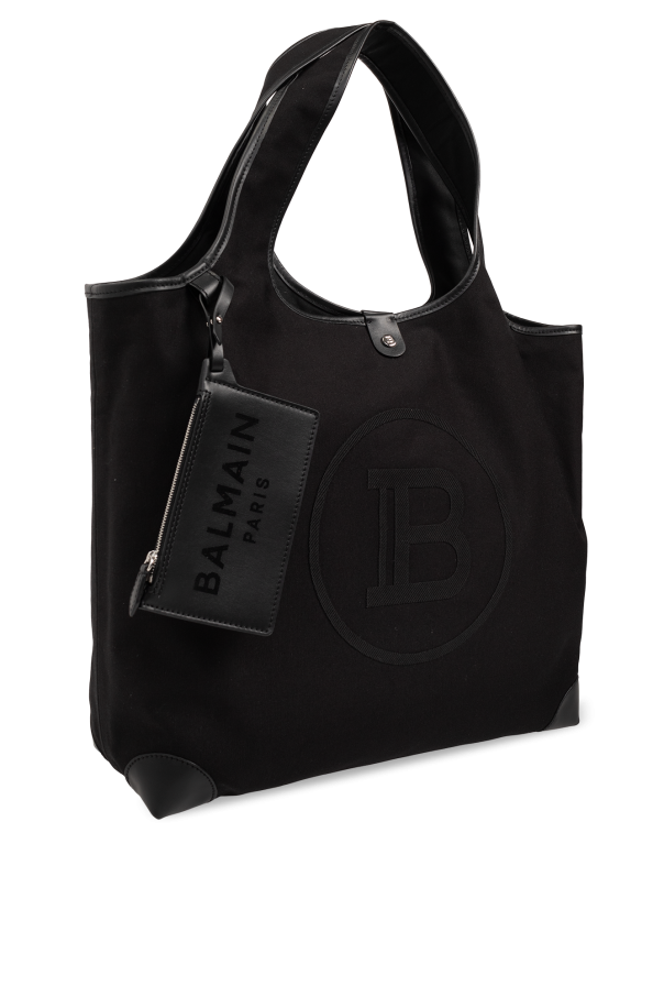 Black shopper bag from Balmain. Made of cotton with leather trims, this design features a magnetic snap, logo embroidery, detachable zipped pouch, two half-round shoulder straps, silver-tone metal hardware and one internal compartment with one snap-fastened pocket and one card slot.