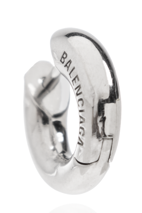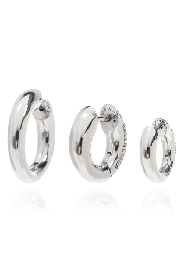 A set of hoop earrings from Balenciaga. Made of sterling silver, this item features a snap closure and a logo engraving. Set of three different sized hoops.