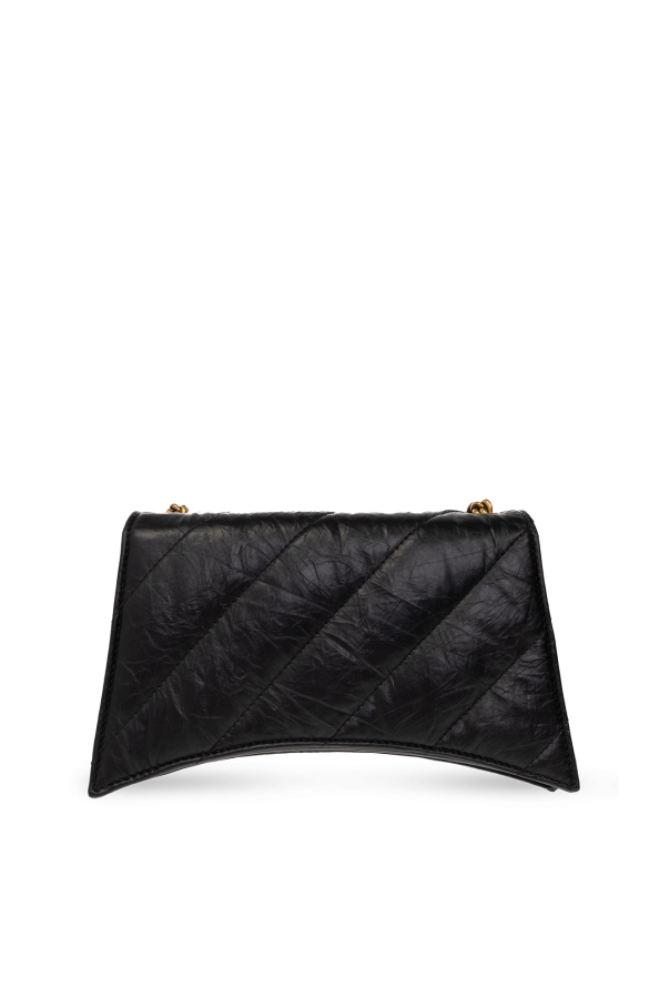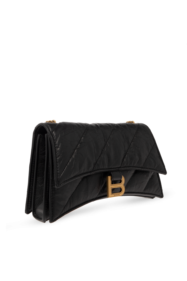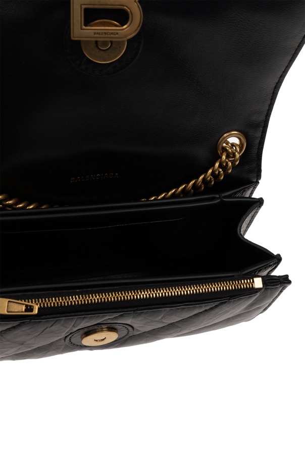Black ‘Crush’ quilted wallet from Balenciaga. Crafted from calf leather with a crease effect, this design secures with a zip and showcases a logo-engraved ‘B’ pendant on the front. It is complete with a chain shoulder strap, antiqued gold-tone metal hardware and one internal compartment with one zip pocket, three slip pockets and two card slots.