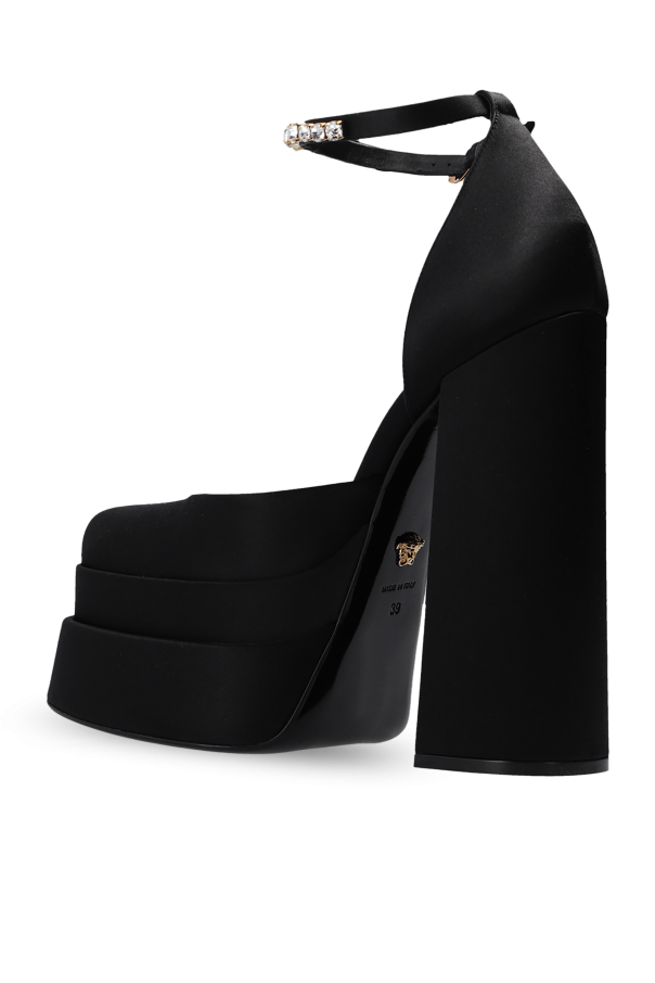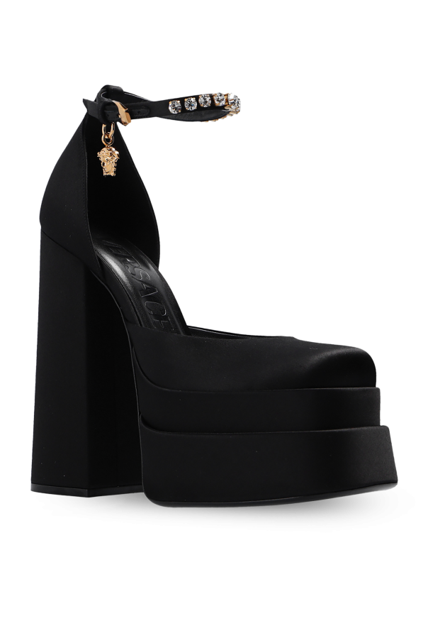 Black pumps from Versace. Emblazoned with a gold-tone logo appliqué, this model sits on a black leather sole and showcases an ankle strap and a square toe.