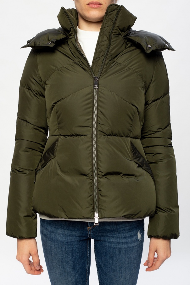 Green ‘Aloes’ quilted down jacket from Moncler. Sporting a logo patch for the brand recognition, this wintry design comes with two-way zip fastening, a drawcord-adjustable hood, two zipped pockets on the front and elasticated cuffs.