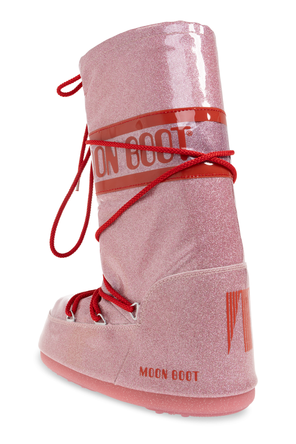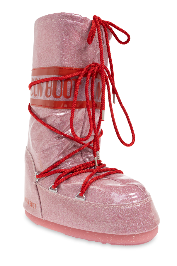 Pink ‘Icon Glitter’ snow boots from Moon Boot. Made of glittery synthetic material with waterproof properties, this lace-up model sits on a pink thermoplastic rubber tread sole and showcases a drawstring upper decorated with red logo prints. Inspired by the footwear worn by astronauts during the 1969 lunar landing, this project combines technical features with a contemporary look.